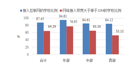 不同地区、不同省份间接入互联网的学校比例、配备多媒体设备的学校比例差距较大,发展不均衡。东、中、西部的具体情况见图3。