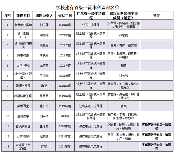 本次入选的课程中,《创新创业基础》线下课程是学校作为广东省大学生创新创业教育示范校的特色课程;《设计素描(二)》《设计色彩与构成》《汽车构造》《大学物理E》《线性代数(双语)》《管理学原理》《路基路面工程》线上线下混合式课程均为所在专业的学科基础课、专业核心课,是学校课程模式改革的代表课程,开展了各具特色的线上、线下混合式教学;《美术写生》社会实践课程是建筑学院的特色实践类课程,师生深入花都乡村一线,认识社会、研究社会、理解社会、服务社会。