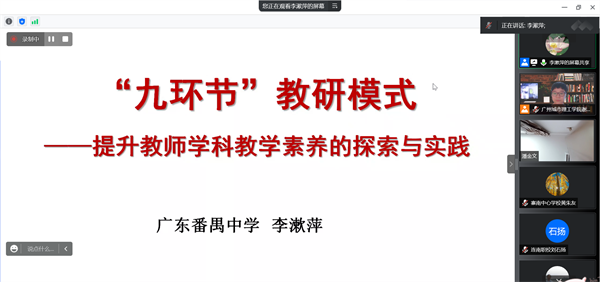 7月15日下午,广东番禺中学的正高级教师李漱萍作《九环节教研模式——提升教师学科教学素养的探索与实践》主题报告。她结合自身教学研究的实践,指出要在及时了解政策法规、教师发展现状和需求、分析制约教师成长因素的基础上开展教研工作,并详细介绍了她探索和研究了12年的“九环节”教研模式,以及如何应用该教研模式促进教师专业成长,提升教师教学素养。