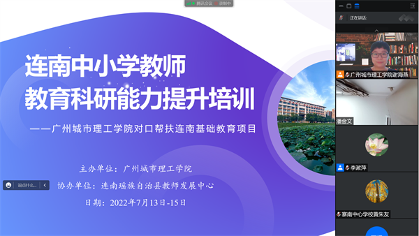 本网讯(记者 谢海燕)为落实我校对口帮扶连南基础教育高质量发展,进一步加强连南中小学教师综合素养提升,在对连南需求调研、沟通协商的基础上,7月13-15日,我校举办连南中小学教师教育科研能力提升线上培训,来自寨南中心学校、连南民族高级中学、连南职业技术学校、连南各中小学教育科研专干及连南教师发展中心教研员共140余名教师参加了本次培训,培训由我校教师教学发展中心办公室主任谢海燕主持。