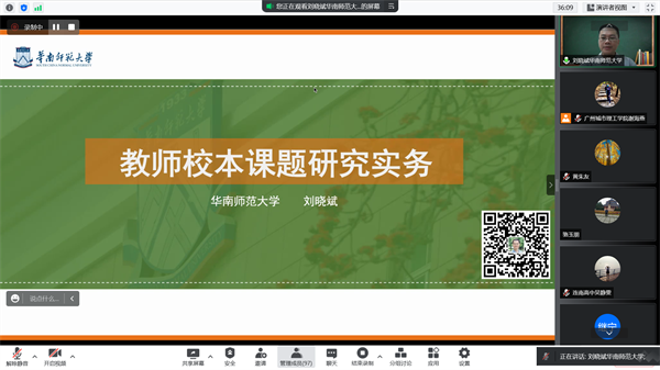 随后,华南师范大学外文学院的刘晓斌副教授做《教师校本课题研究实务》主题报告。他围绕教师校本课题研究的选题、课题申报、研究实施介绍了选题的原则与方法,指出中小学校本课题研究应“小题大做”,选题时要有明确的研究对象和方法,要围绕热点、难点、痛点、重点去选题,选题内容要有学科属性,研究过程要易于执行和评价,在撰写课题申报书时要有严谨的逻辑性,并结合实际案例分享了如何撰写研究背景和文献综述,培训最后,他介绍了适合中小学教师开展校本研究的行动研究。