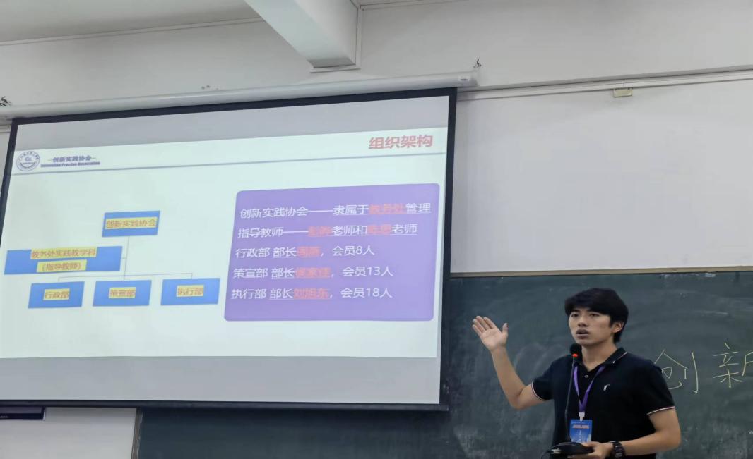 会议主要围绕创新实践协会成立的性质、目的、意义及协会成员具体工作开展。主持人刘旭东讲述了社团成立过程、社团会徽、组织架构等,同时也介绍了社团指导老师和各部门成员情况。随后各部门部长也介绍了各部门的工作计划、工作职责和工作要求。会上,协会指导老师陈思对协会未来三年工作规划作出详细阐述。