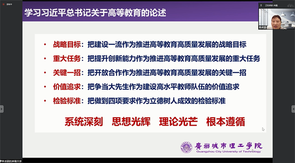 赵永林作“做政治合格的人民教师”主题报告,他强调了师德师风建设的意义,介绍了校内外优秀教师案例,分享了8个警示案例,并带领大家学习了有关师德师风的政策、文件和重要讲话。吕志作“树优良师德师风,做优秀高校教师”主题报告,他谈及了对优秀教师、学生喜爱教师的理解,并通过张桂梅、黄大年等优秀教师事迹和其自身教学经历讲述了他对师德师风和优秀教师的理解与感悟。张星明以他对“应用型人才培养的几点思考”,分析了我校发展面临的机遇与挑战,介绍了“专创融合”“学科交叉融合”“产学产教融合”等教育改革主线,并分享了“项目驱动、实践驱动、名校驱动、竞赛驱动”等课堂教学模式和实践教学体系。