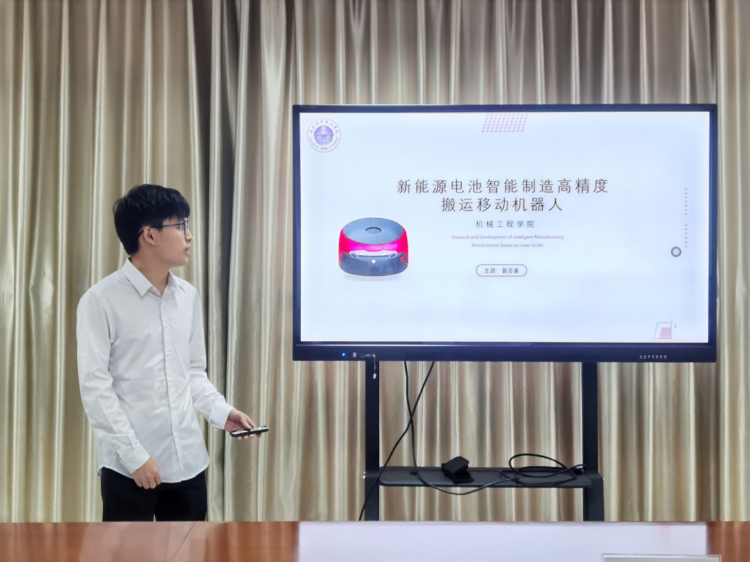 曾志豪现场演说《新能源电池智能制造车间高精度搬运移动机器人》项目(卢蕴祺 摄)