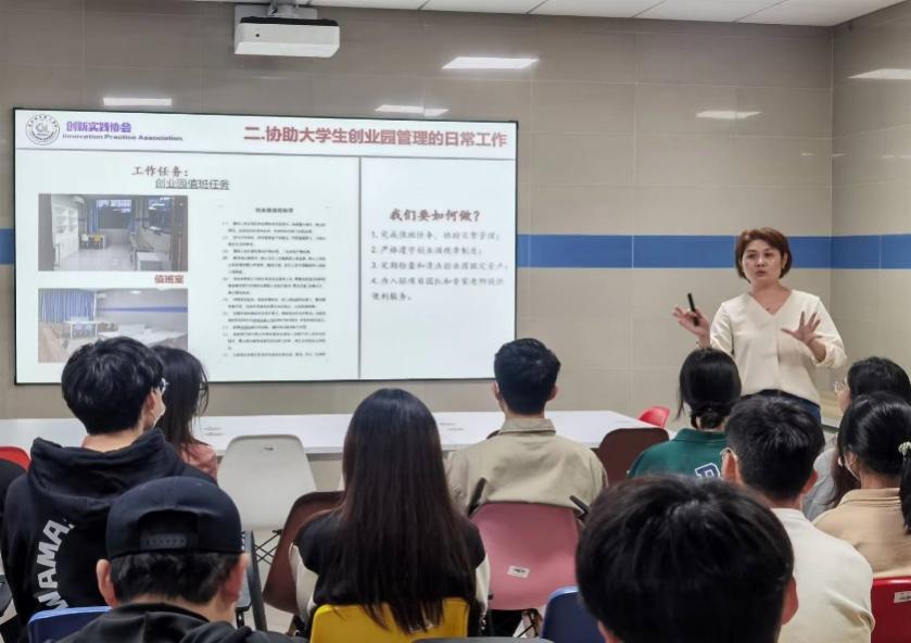 会上,彭晔老师还向创新协会成员介绍了设施齐全、环境甚佳的创业园区。对每位成员完成值班任务、协助创业园的日常管理作出要求,例如严格遵守创业园规章制度,定期检查和清点创业园固定资产,为入驻项目团队和专家老师提供便利服务。