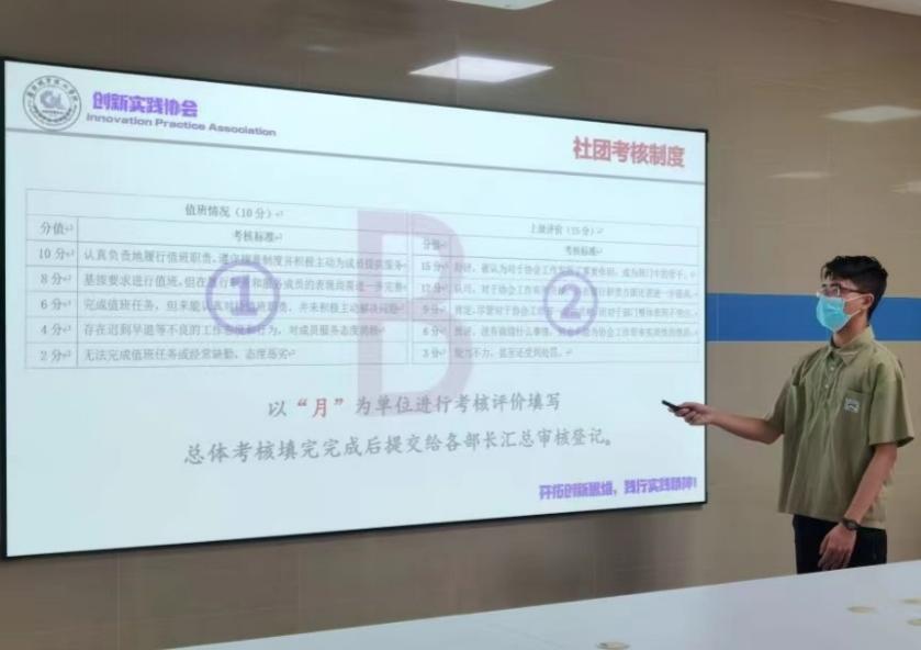 新晋行政部部长严俊贤介绍了各部门部长的工作职能,讲述了社团考核制度的一些细则,考核指标分为社团日常活动的考核要求和社团主管单位分配任务的考核要求两类。主要针对成员在活动中的表现打分,并以自评、同级互评和上级评价进行综合评估。总评以月为单位,总体考核完成后将会交给各部部长汇总审核登记。最后严俊贤希望创新协会成员能够严格按照规章制度完成工作。