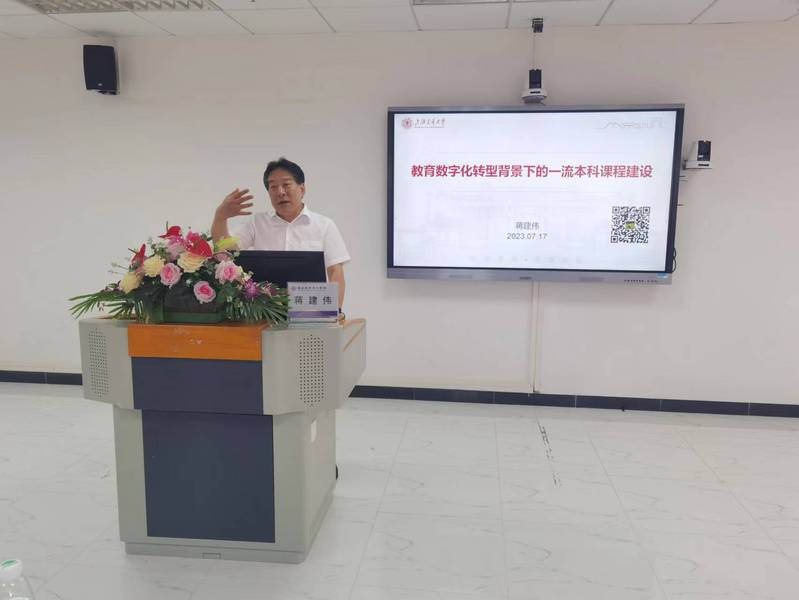 本网讯(记者 冯慧雅)为推动教师运用数字化手段开展教学模式改革与一流本科课程建设,7月17日下午,教务处在行政楼517会议室举办“教育数字化转型背景下的一流本科课程建设”专题讲座。讲座邀请教育部高等学校教学信息化与教学方法创新指导委员会委员、教育部产学合作协同育人项目专家组成员、上海交通大学蒋建伟教授为主讲。我校申报一流本科课程及开展混合式教学改革的50余名教师参加学习。