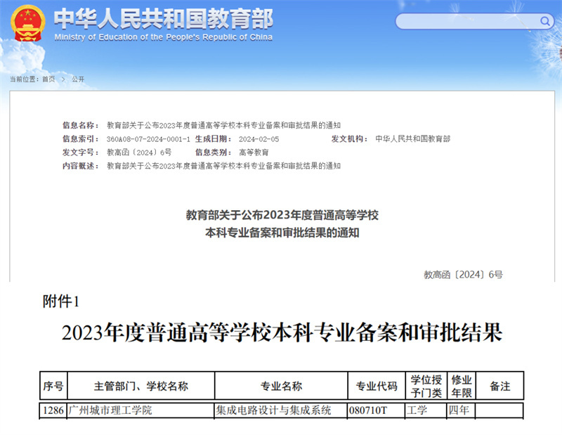 本网讯(记者 刘伟俭 冯慧雅)3月18日,教育部发布了《教育部关于公布2023年度普通高等学校本科专业备案和审批结果的通知》(教高函〔2024〕6号),我校成功获批开设“集成电路设计与集成系统”本科专业。截至目前,学校共有本科专业46个,其中6个专业入选广东省一流本科专业建设点。