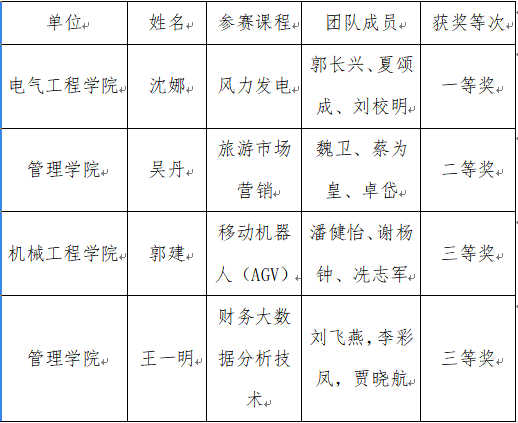 经过教务处审查参赛队伍资格、专家现场评审等环节,共评出一等奖1 项,二等奖 1 项,三等奖2项。现将有关情况公示如下: